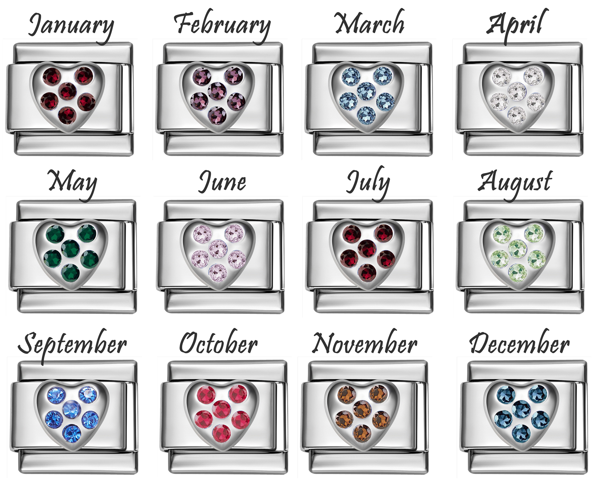 BIRTHSTONE BIRTHDAY LOVE HEART CZ RHINESTONES 9mm Charm x1 ITALIAN CHARM - JAN to DEC