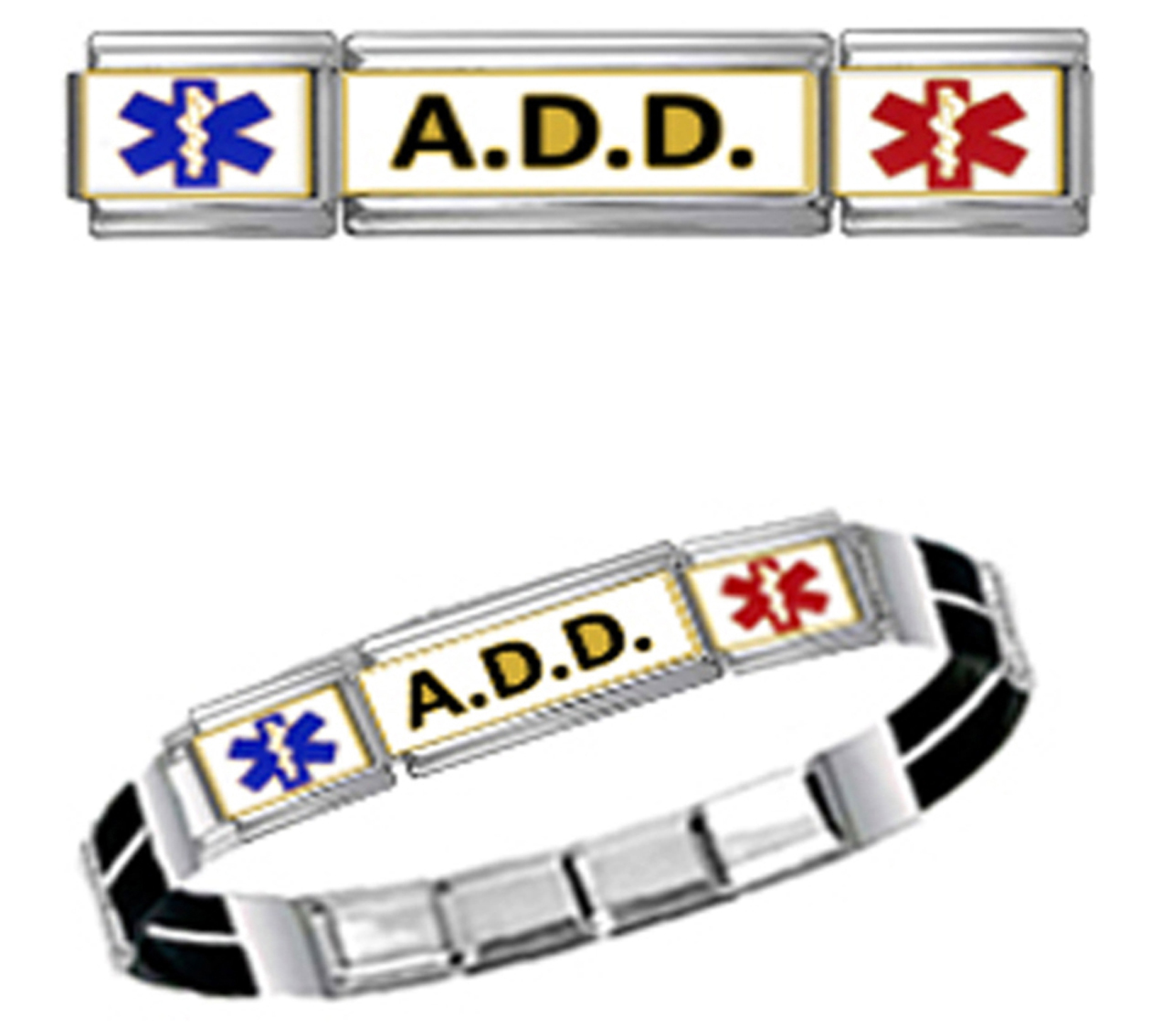 ADD A.D.D. MEDICAL ID 9mm+ Italian Charm BLACK SURFIE RUBBER SPLIT Starter Bracelet
