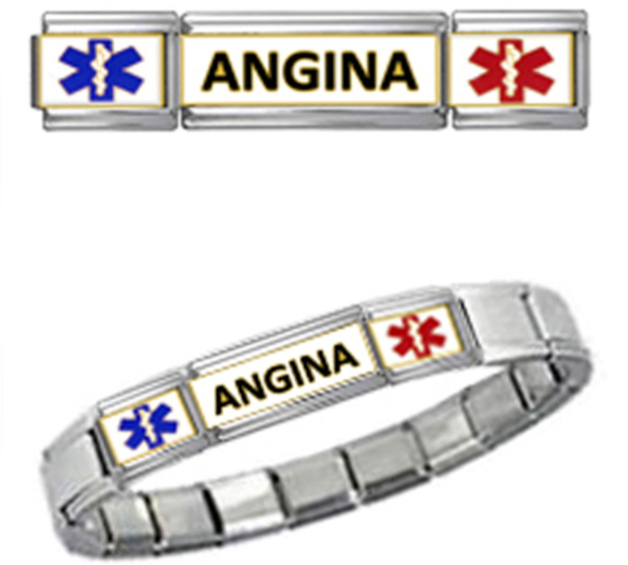 ANGINA MEDICAL ALERT ID 9mm + Italian Charm SILVER TONE SHINY POLISHED Starter Bracelet