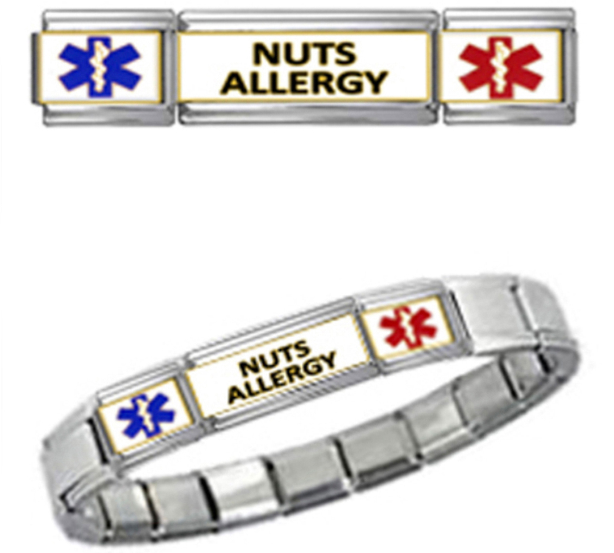 NUTS ALLERGY MEDICAL ID 9mm + Italian Charm SILVER TONE SHINY POLISHED Starter Bracelet